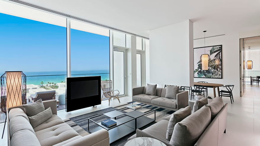 Этот просторный и эффектный люкс с двумя спальнями залит естественным светом благодаря высоким потолкам, панорамным окнам и обширной террасе с великолепным видом на Персидский залив. Просторная центральная гостиная оборудована современным камином, обеденной зоной и всеми современными удобствами. К вашим услугам спальня с кроватью размера «king-size» и собственной ванной комнатой, спальня с двумя односпальными кроватями и собственной ванной комнатой, в обеих спальнях установлены скульптурные ванны, а также отдельная гостевая ванная комната.