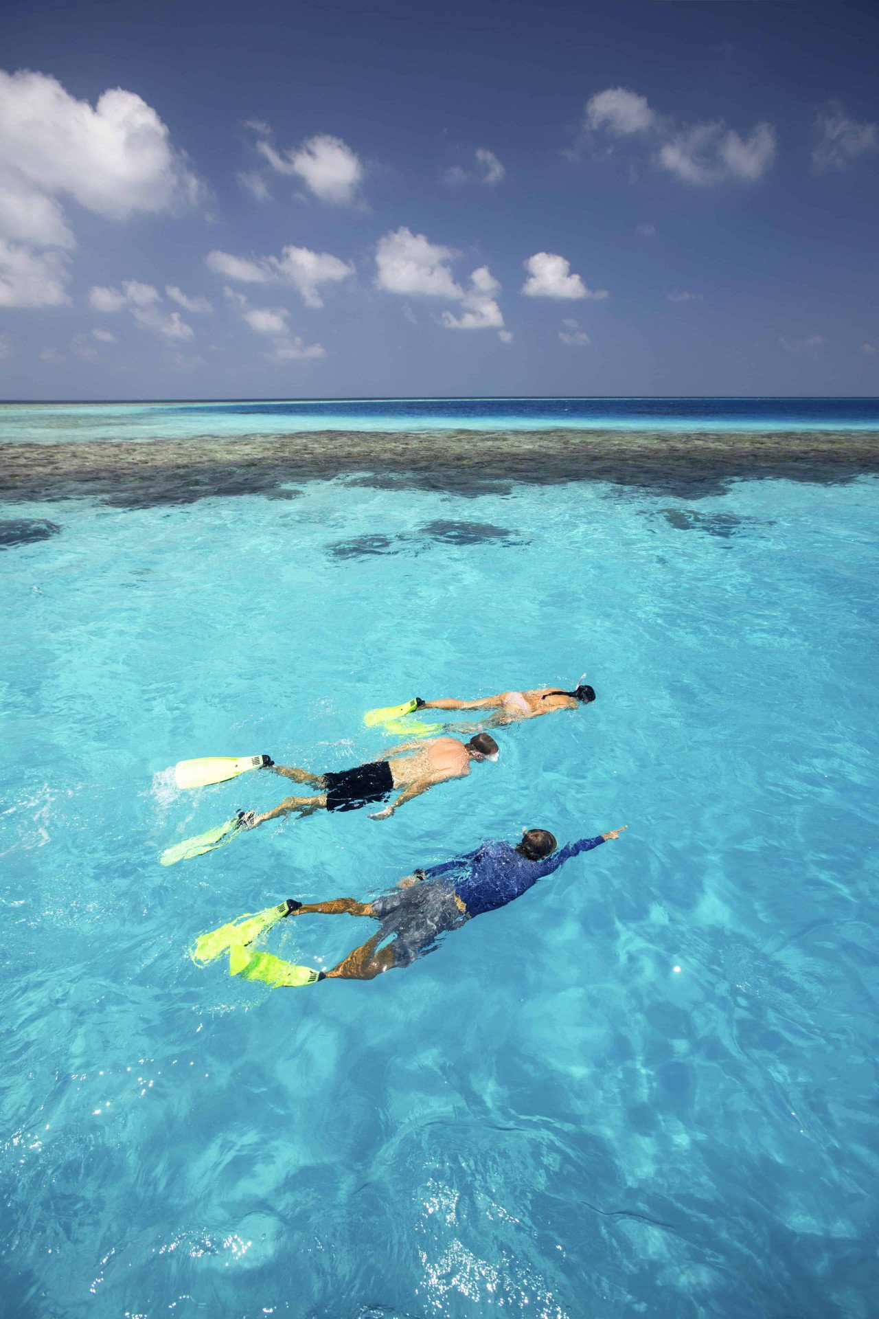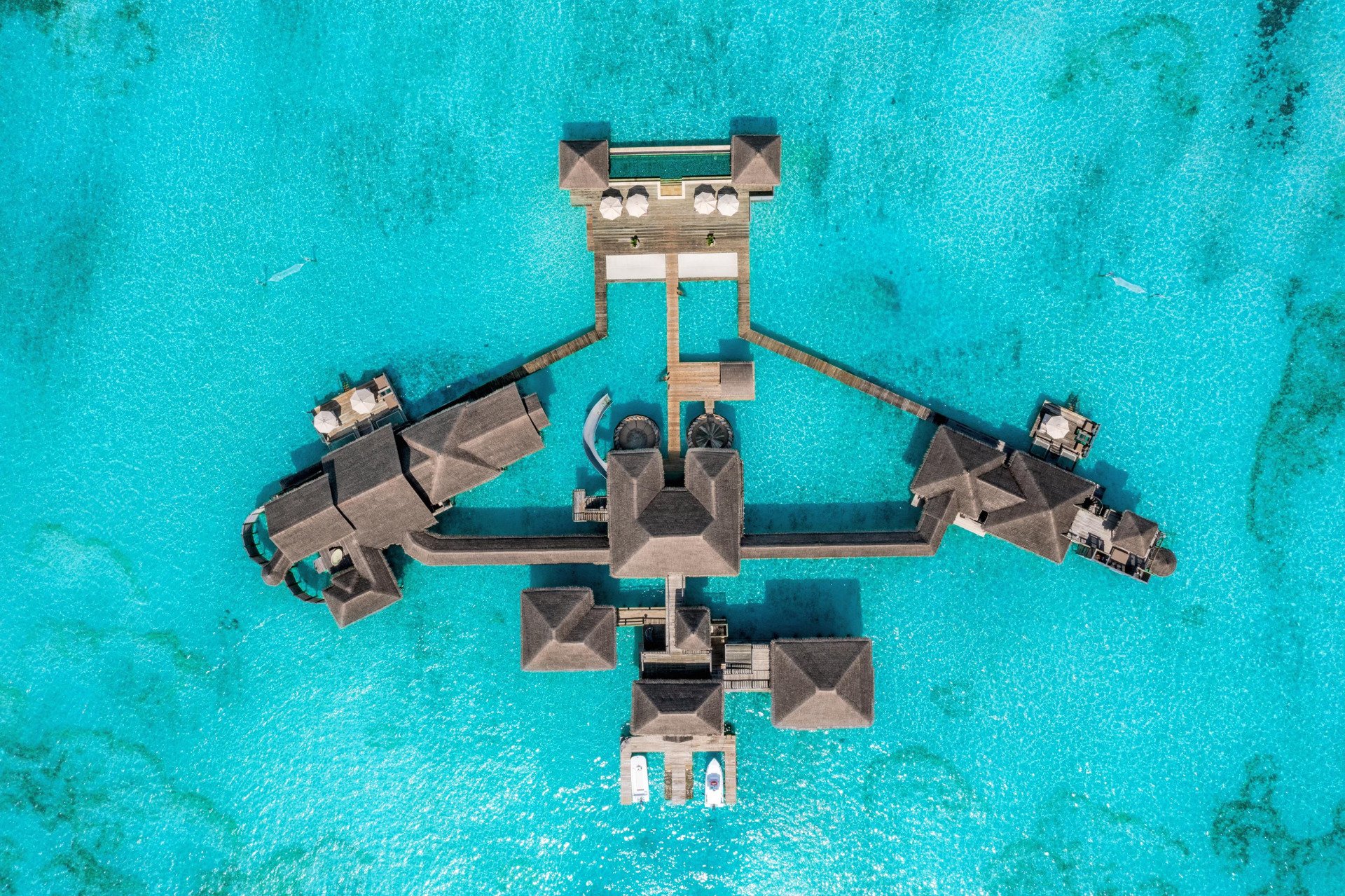 - Засмага на терасах на рівні моря з шезлонгами та сітками для катамаранів, що пропонують прямий доступ до кришталево чистих коралових садів та дивовижного морського життя.