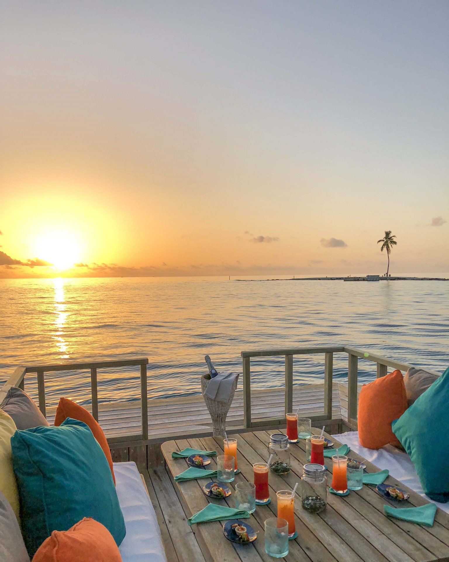 - Сонячна тераса над водою з катамаранськими сітками, шезлонгами, кушетками та прямим виходом до океану